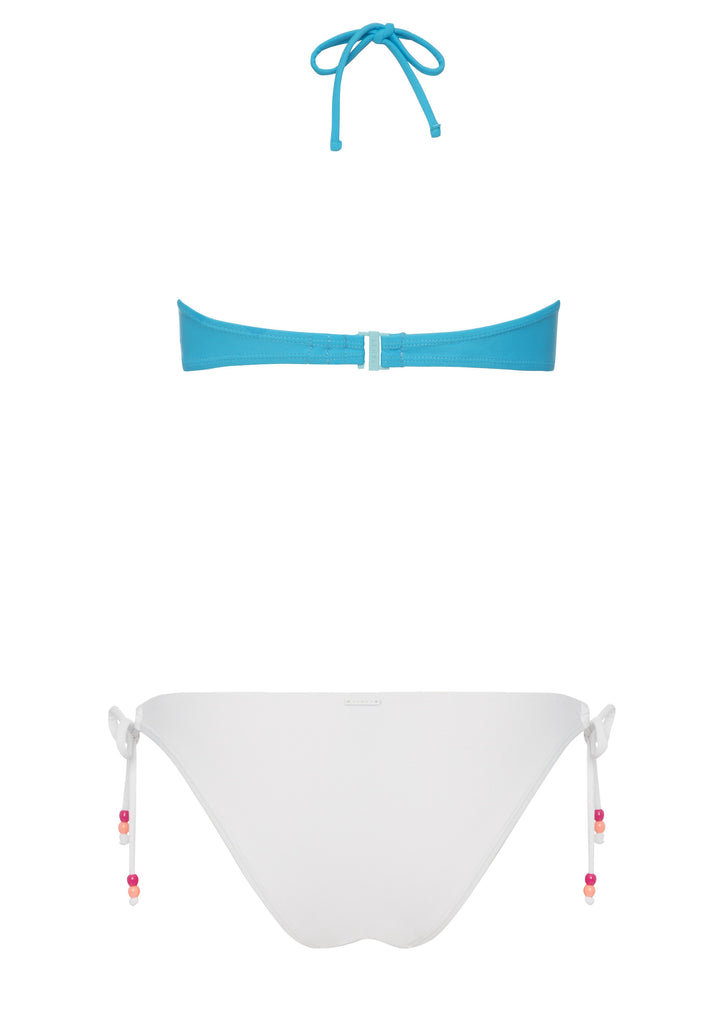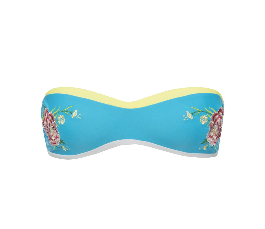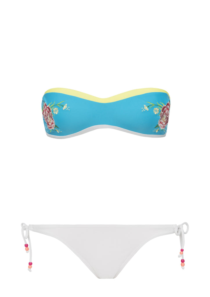 Bustier bandeau in aquamarine with flower embroidery and toning two colour piping + Tie side bottom in white