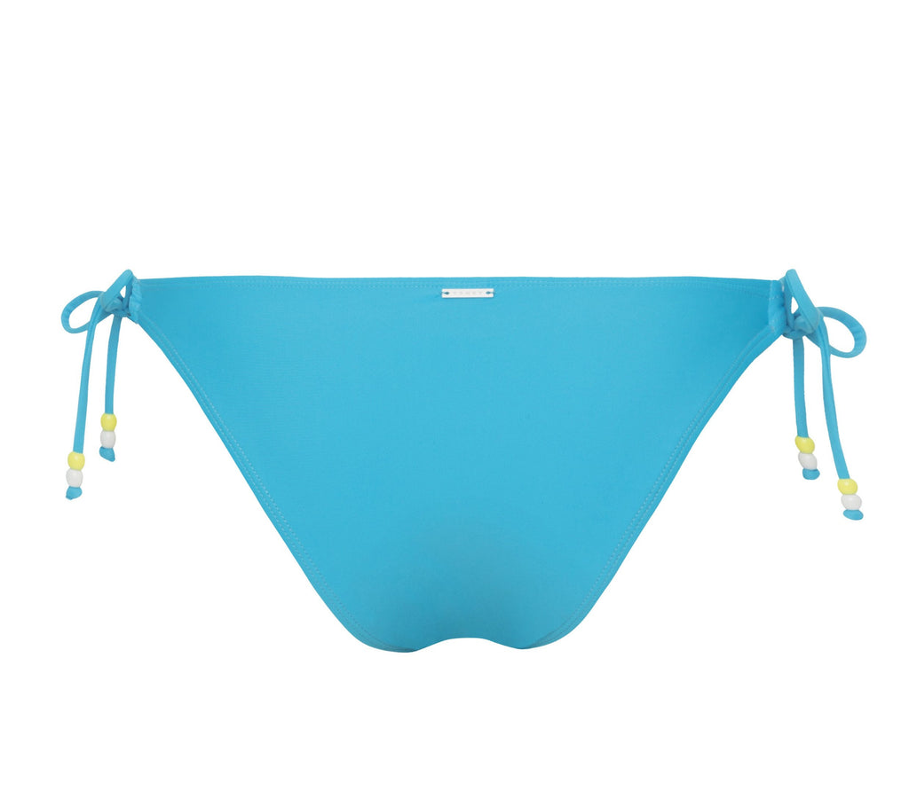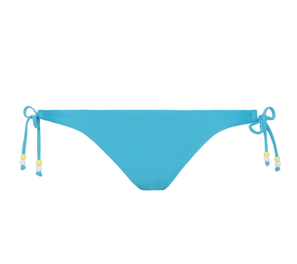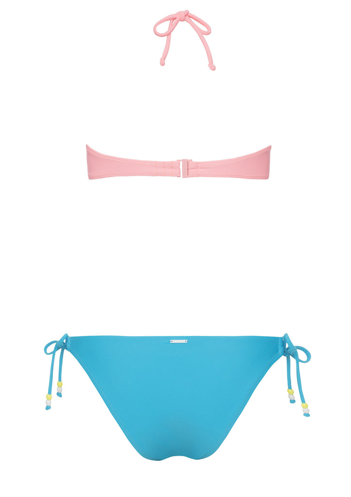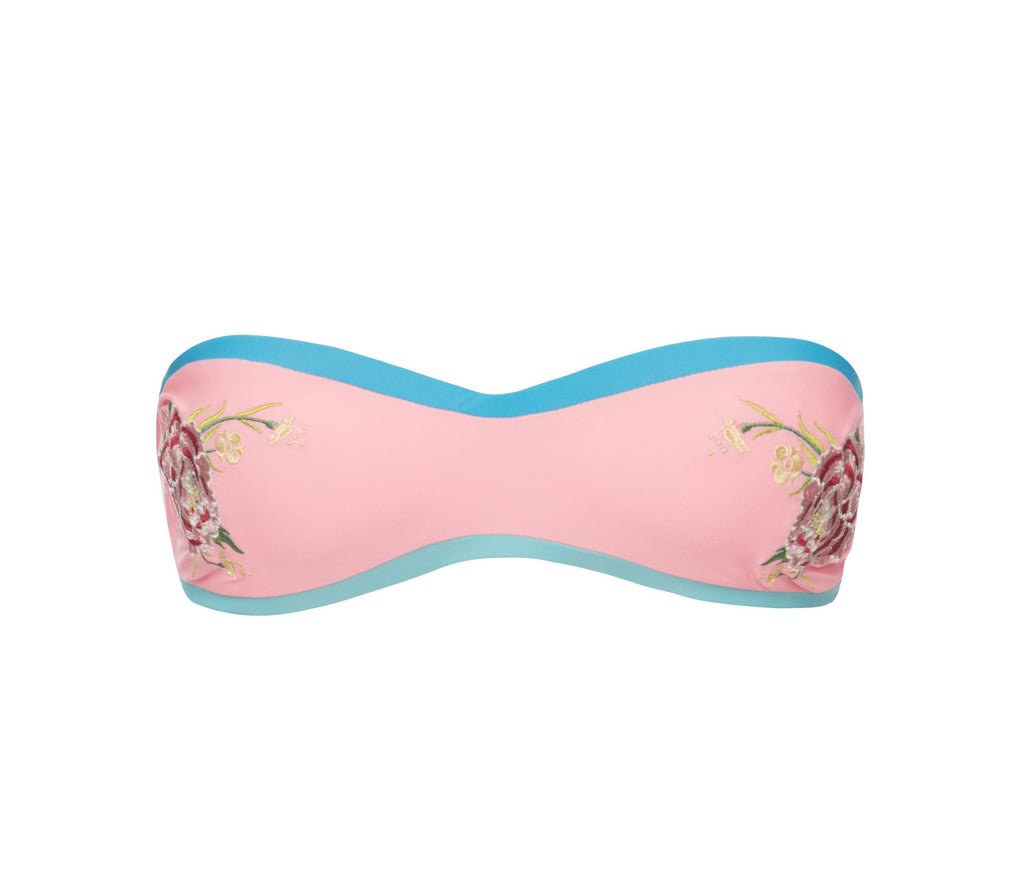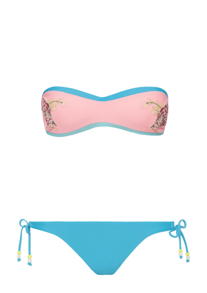 Bustier bandeau in salmon with flower embroidery and toning two colour piping + Tie side bottom in aquamarine